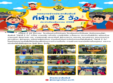 วันศุกร์ ที่ 26 ธันวาคม โรงเรียนบ้านวังนกแอ่น โรงเรียนบ้านวังดินสอ จัดกิจกรรมกีฬาสัมพันธ์ “กีฬาสี 2 วัง” นำโดย นายเฉลิม แก้วเกิด นายสิทธิชัย มาไชยนาม ประธานในพิธีเปิด พร้อมด้วยนายมนตรี ชัยชราแสง และ นายสุรเชษฐ์ แสงอาทิตย์ ผู้อำนวยการ คณะครู และบุคลากร คณ